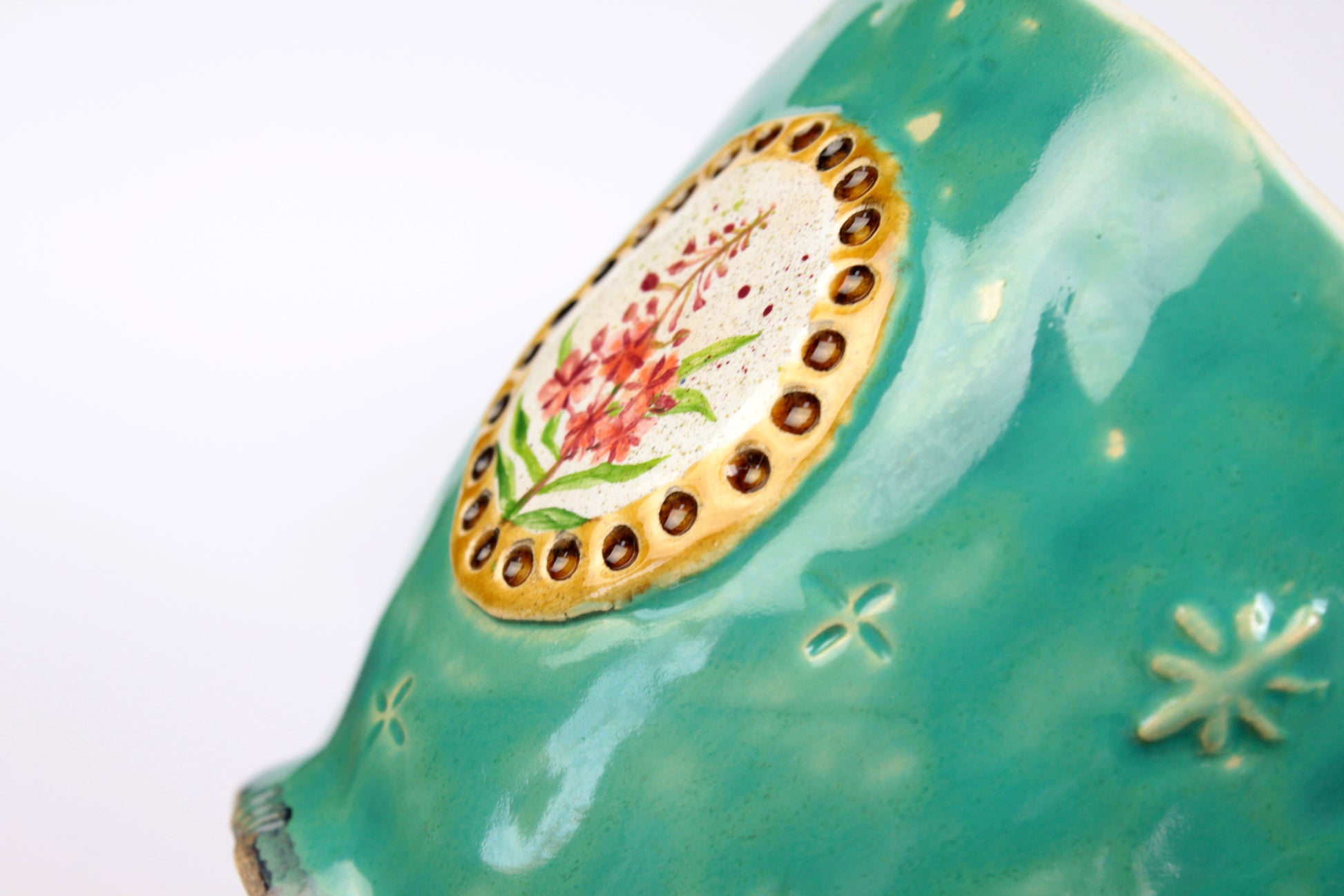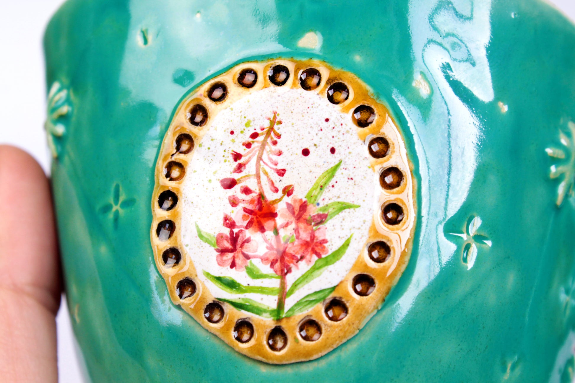 An absolutely beautiful tea mug with a hand drawn illustration of fireweed in a fabulous frame.